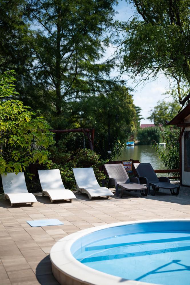 Wellness részlegünkhöz tartozik egy 8 személyes finn szauna, illetve egy 8 személyes jakuzzi is, amely külön helyiségben található Körösparti panorámával.