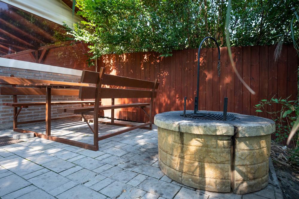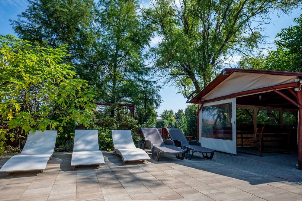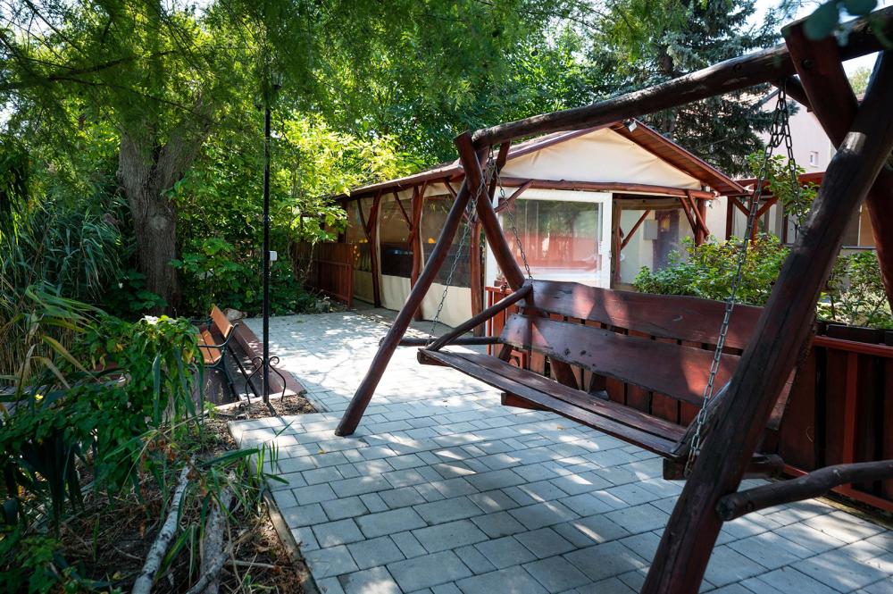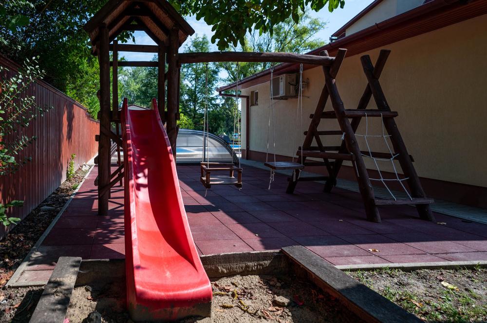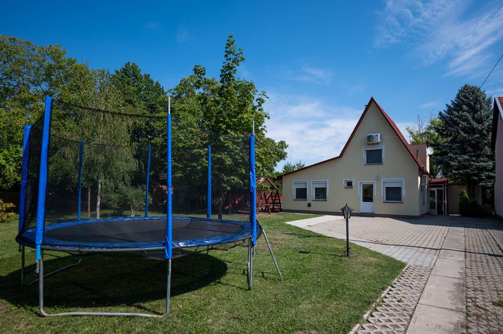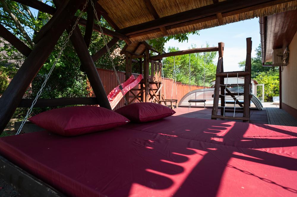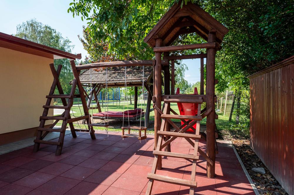 A gyerekek számára található játszótér, trambulin, a felnőtteknek pedig kényelmet nyújtó rönkfa kiülő és kétszemélyes hintaágy.