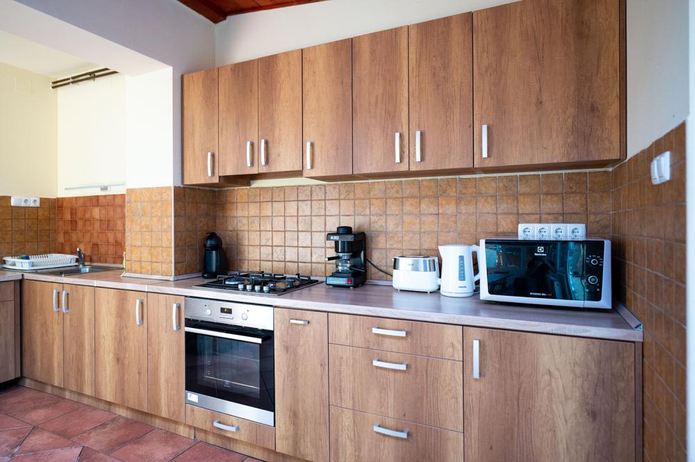 A ház földszintjén található 1 családi szoba saját fürdőszobával, a tágas nappali a maximálisan felszerelt konyhával egybe van építve, különálló fürdővel, mosogatógéppel, saját klímaberendezéssel, sütővel, mikrohullámú sütővel, két fajta kávéfőzővel (Dolce Gusto, Szarvasi), 2 db kombinált hűtővel, különálló fürdővel.