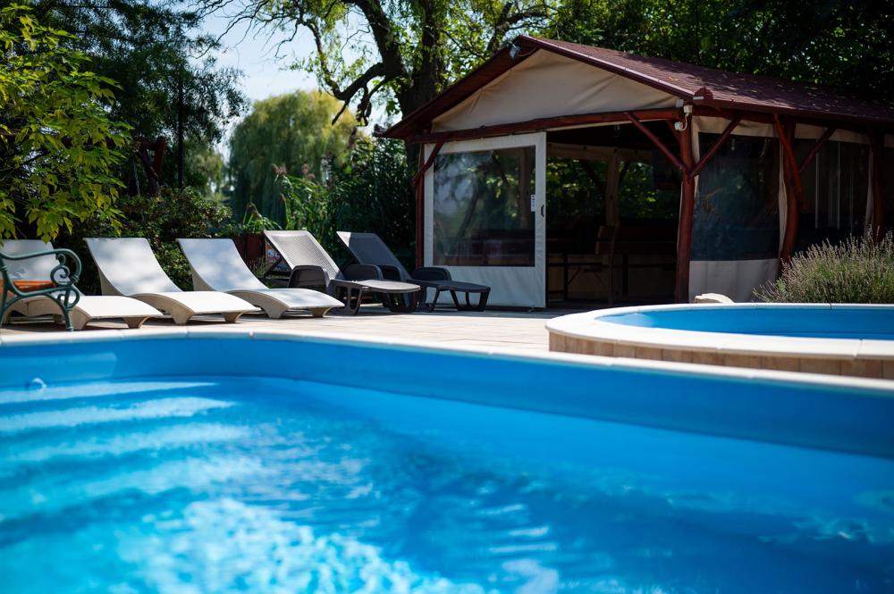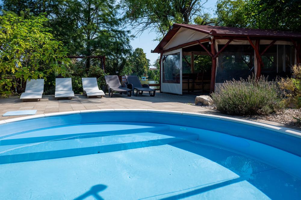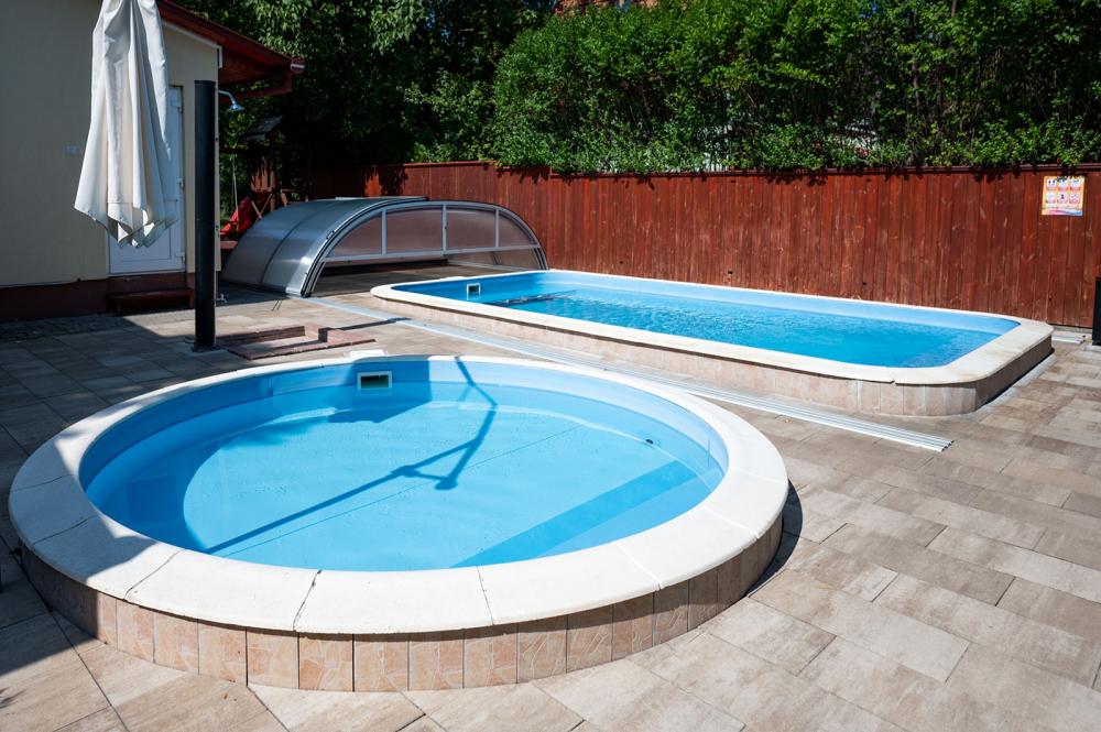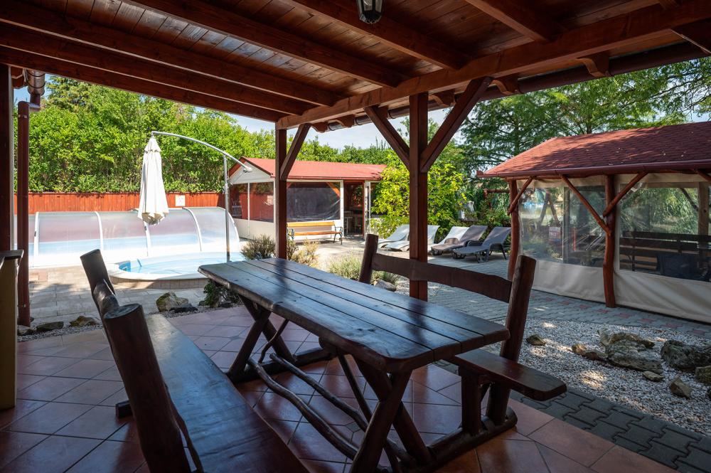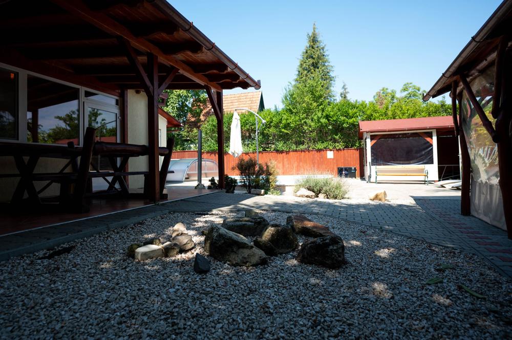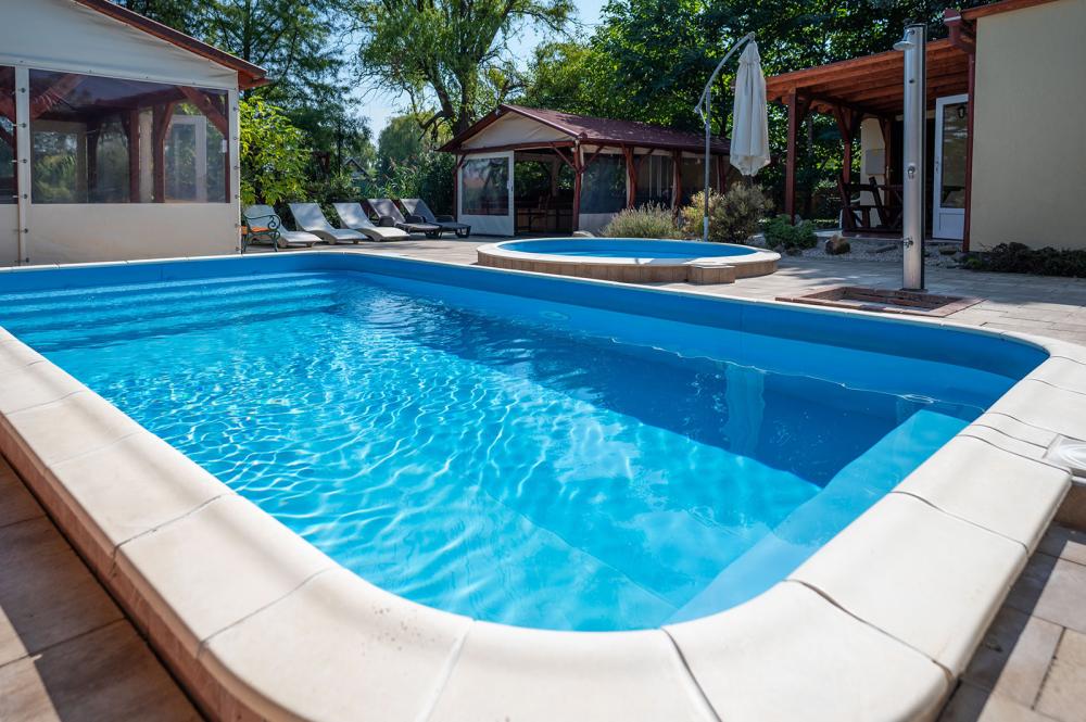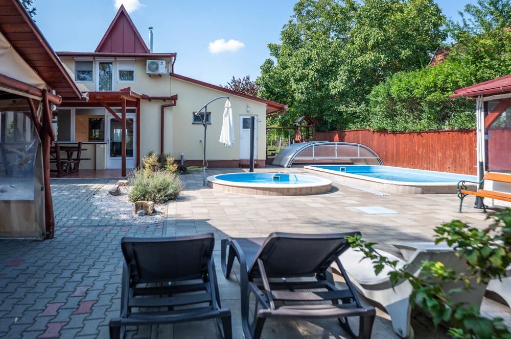 Az udvaron hőszivattyúval fűtött, mobil fedéssel ellátott egyedülálló nagymedence, valamint egy gyerekmedence található (a medence használata 05.01-10.30. között biztosított), melyet a ház alapára tartalmaz. Vize átlagosan 28 Co - 31 Co-os, mellette a napozóterasz nyugágyakkal..