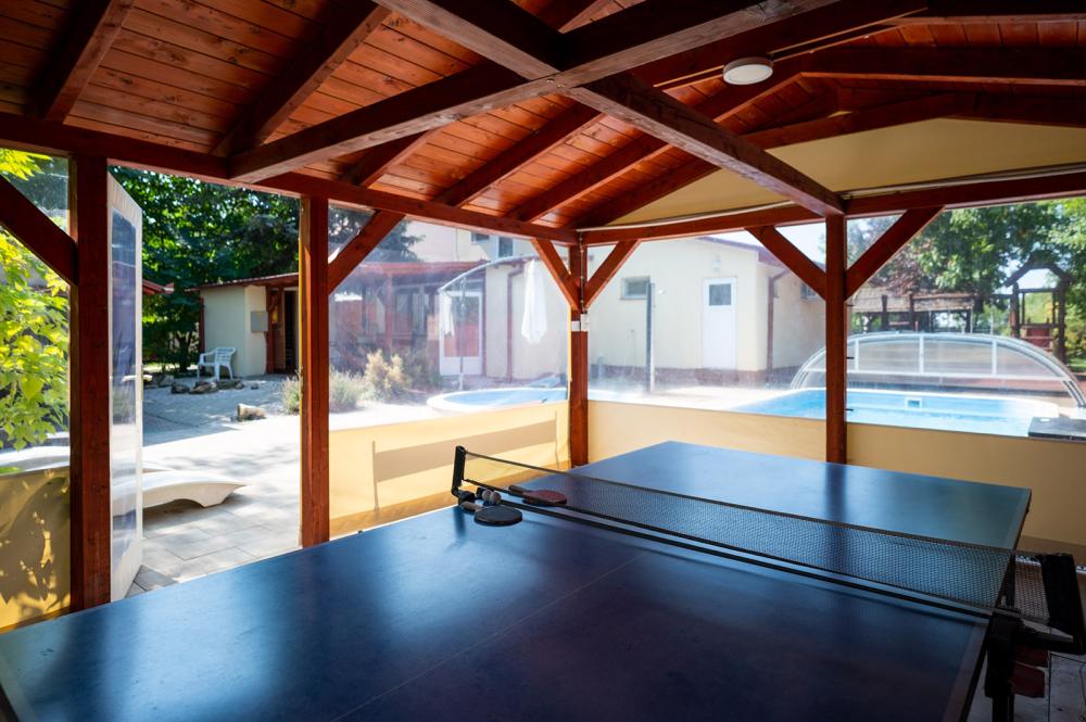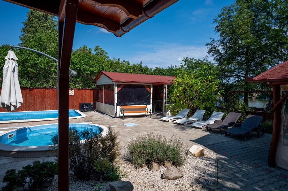 A vízpart felőli részen, saját lekerített stég, mellette egy zárt, fedett külső konyha ping-pong asztallal.